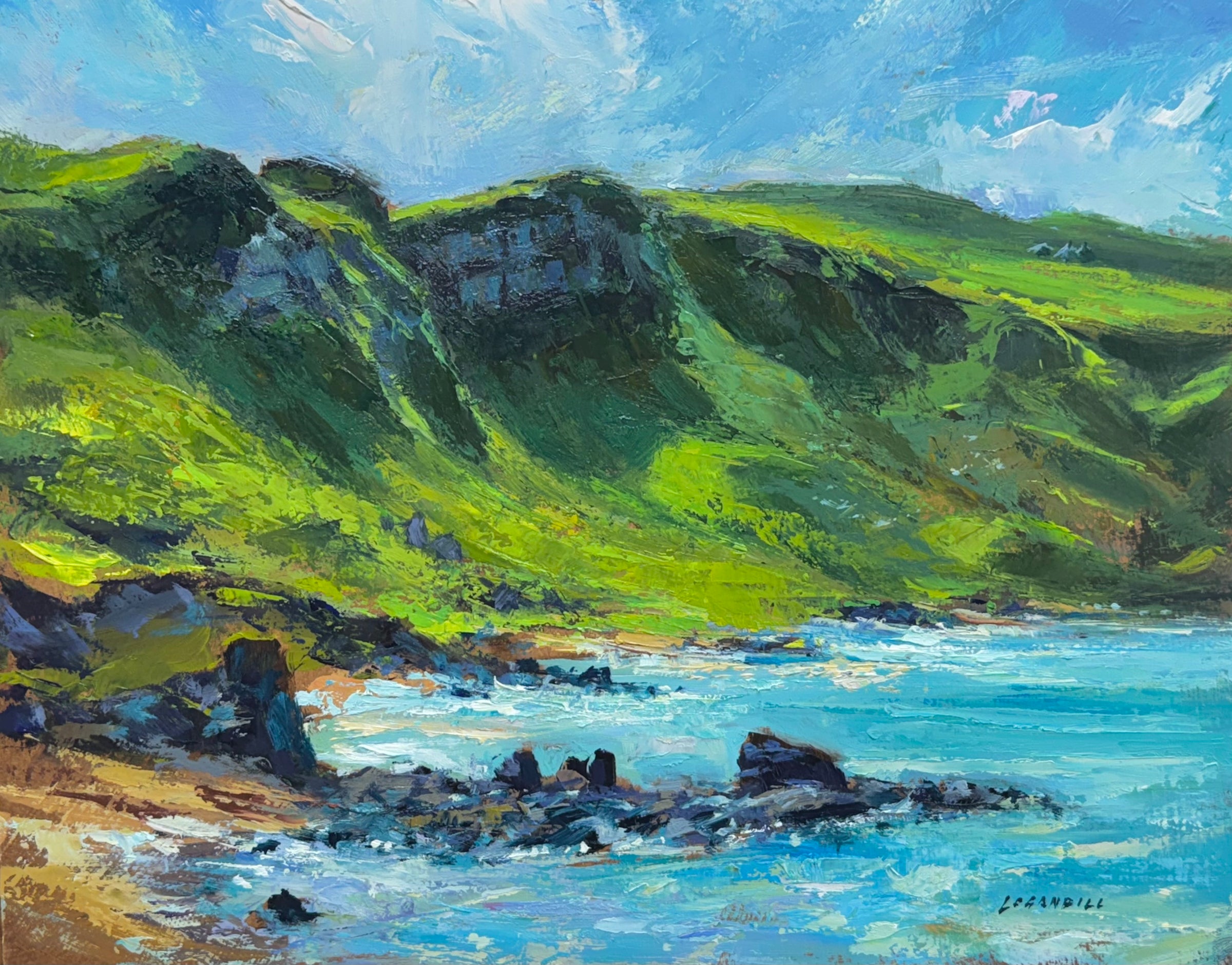 I spent a very windy (30-40mph) day painting here at the Gauldrons, near Machrihanish (Scotland). I had my easel well anchored with heavy stones, but my brush was bouncing around! It was great light and good fun though. I got what I needed from firsthand observation and then carried it forward another 20 percent-ish in the calm studio.